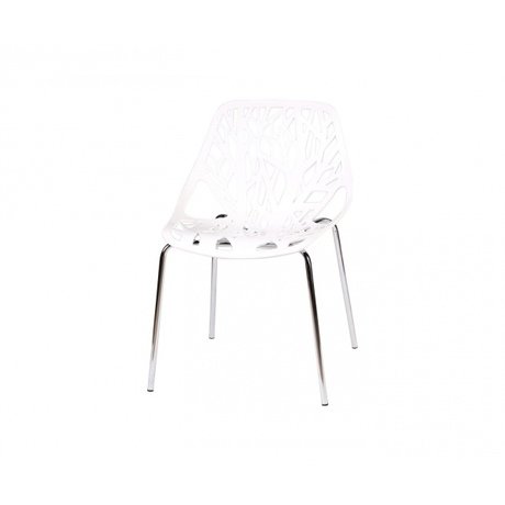 Привлекательный стул с уникальным дизайном сидения и спинки, которые выполнены из единого элемента, материалом для которого послужил толстый высокопрочный пластик молочно-белого цвета. Корпус данного стула украшает перфорация в виде кромки дерева. Длинные хромированные ножки придают модели легкость.