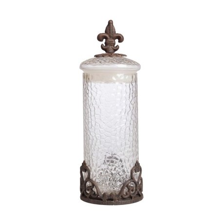 Декоративная банка для хранения изготовлена с использованием художественного литья с нанесением рельефного рисунка, помещена в подставку, декорированную металлической вязью. Удобная ручка, в виде геральдической лилии на крышке, выгодно дополняет общий дизайн банки.