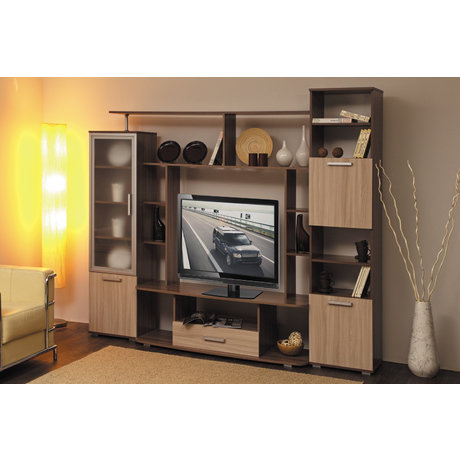 Стенка для гостиной "Олимп-М19" изготовлена из ламинированной ДСП толщиной 16 мм, слева у стенки есть шкаф-витрина с распашной дверью из матового стекла в рамке из МДФ цвета металлик, внутри - ниша с тремя полками. Внизу шкафа-витрины - секция с откидной дверью, за дверью - одна полка. В тумбе для ТВ  - три открытые ниши и один большой выдвижной ящик. Ниша для ТВ слева и справа оборудована симметричными открытыми секциями с двумя полками в каждой. Выше расположена открытая полка с карнизом, установленным на декоративную трубу цвета хром. Справа у стенки есть пенал с открытыми и закрытыми полками.