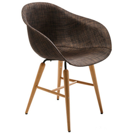 Сиденье этого стула представляет собой единую конструкцию анатомической формы со спинкой и подлокотниками. Поверхность фактурная, напоминающая плетение грубой ткани. Деревянные ножки высокие и стройные, цвета натурального дерева.