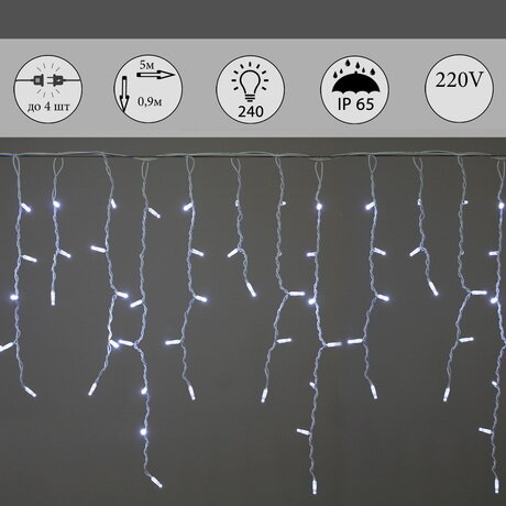 Название: | A-517 W гирлянда светодиодная "Бахрома", 5х0,9м, 240LED, провод белый, морозостойкий |
