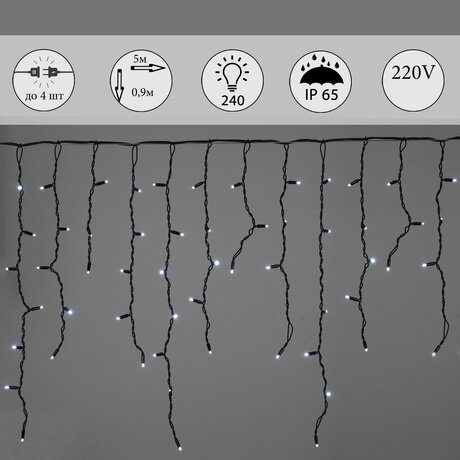 Название: | A-518 W гирлянда светодиодная "Бахрома", 5х0,9м, 240LED, провод черный, морозостойкий |