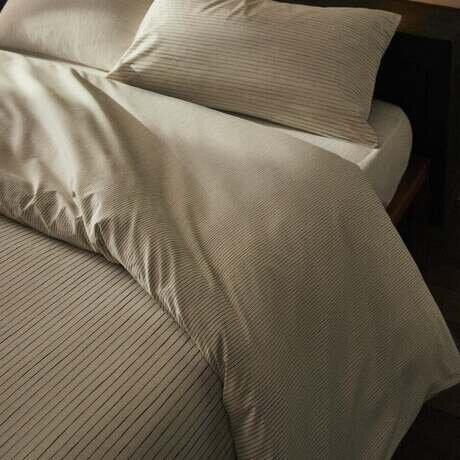 Пододеяльник из перкаля плотностью 200 нитей с двусторонним полосатым принтом с узкими полосками с одной стороны и более широкими с другой Потайная застежка на пуговицы внизу.