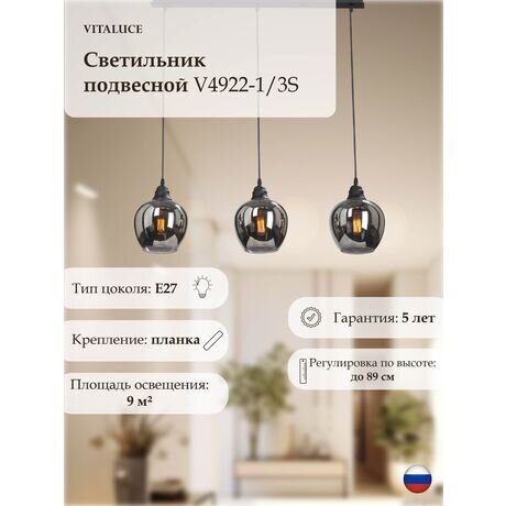Ищете стильное освещение, которое станет центром внимания в современном интерьере? Подвесной светильник V4922-1/3S от Vitaluce с тремя дымчатыми плафонами осветит до 9 м² пространства и добавит помещению индустриальный шарм. Три главных преимущества: - Регулировка высоты до 89 см — настройте подвес под любую высоту потолка - Универсальный цоколь E27 — совместим с LED, филаментными и обычными лампами - Гарантия 5 лет — светильник прослужит без проблем долгие годы Светильник идеально подойдет для помещений от 12 м². Три компактных плафона из дымчатого стекла располагаются на одной планке длиной около метра, что позволяет равномерно осветить обеденный стол, барную стойку или кухонный остров. Черная матовая арматура гармонично впишется в лофт, скандинавский и индустриальный интерьеры. Технические детали: - Цоколь E27 — используйте лампы мощностью до 40 Вт или энергосберегающие эквиваленты - Пылевлагозащита IP20 — подходит для сухих помещений - Механическое управление — простое включение/выключение без дополнительных настроек - Совместимость с натяжными потолками — монтаж не требует специальных креплений Светильник поставляется в разобранном виде, но сборка интуитивно понятна и займет не более 20 минут. В комплекте идет крепежная планка для быстрого монтажа на потолок. Уход: для очистки плафонов достаточно протереть их сухой мягкой тканью. Черный матовый корпус не требует специального ухода и не показывает отпечатки пальцев.Отзывы