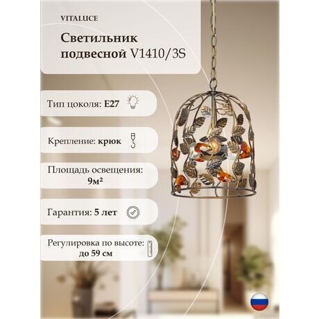 Ищете светильник, который станет не просто источником света, а настоящим украшением интерьера? Подвесной светильник V1410/3S от Vitaluce превращает освещение в элемент декора благодаря оригинальному дизайну с металлическими листьями и цветными вставками. При площади освещения 9 м² он идеально подходит для гостиных и столовых средних размеров.Три главных преимущества: