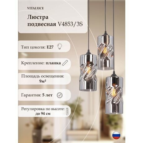Ищете функциональное и эстетичное освещение для вашего пространства? Подвесная люстра V4853/3S от Vitaluce освещает до 9 м² помещения и сочетает в себе современный дизайн со стилем ар-деко. Три стеклянных плафона с интересным спиральным узором создадут в вашем интерьере атмосферу изысканного комфорта.Три главных преимущества: