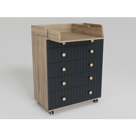 - Мобильность — установлен на колесиках для легкого перемещения по комнате - Трансформируемость — после того как ребенок вырастет, превращается в обычный комод - Контрастный дизайн — сочетание натурального дерева и темно-серых фасадов впишется в современный интерьерПродуманная эргономика