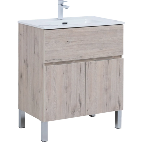 Нужна тумба, которая не займет половину ванной? Модель «Алвита» шириной 70 см подойдет даже для помещения от 3,5 м². Система доводчиков на дверцах и ящике — закрываются бесшумно, даже если хлопнуть. Три главных преимущества: - Вместительное хранение — верхний выдвижной ящик для косметики и два отделения за дверцами для бытовой химии и полотенец - Устойчивые хромированные ножки — выдерживают вес до 80 кг, регулируются по высоте для компенсации неровностей пола - Влагостойкое покрытие — ЛДСП с защитой от брызг, можно протирать влажной тряпкой без риска деформации Тумба подойдет для ванной комнаты площадью от 3,5 м². Габариты 70×45,7×83,4 см — оптимальны для размещения между стиральной машиной и душевой кабиной. Рассчитана на семью из 2–4 человек: в ящике поместятся средства ухода, в нижних отделениях — запасы моющих средств и текстиль. Технические характеристики: - Декор «дуб веллингтон белый» — светлая фактура натурального дерева сочетается с белой сантехникой и плиткой пастельных оттенков - Матовое покрытие — не остаются отпечатки пальцев и разводы от воды - Универсальные петли — дверцы навешиваются справа или слева, можно адаптировать под планировку - Встроенные доводчики — защищают фасады от сколов при резком закрывании, продлевают срок службы фурнитуры - Хромированная фурнитура — ручки и ножки не окисляются от влаги, сохраняют блеск Поставляется в собранном виде — достаточно установить ножки и отрегулировать их высоту. Гарантия 2 года покрывает дефекты материалов и фурнитуры.Отзывы