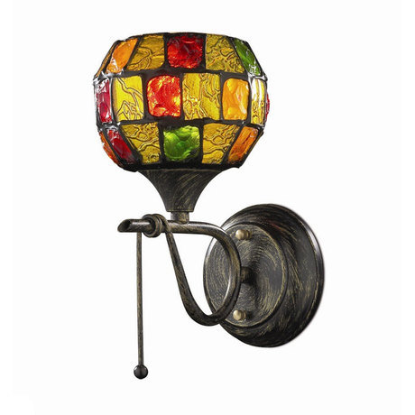 светильник настенный с плафоном из разноцветного фактурного стекла, выполнен в технике витража. Разноцветные кусочки стекла оживают, когда внутри светильника загорается лампочка и становятся ещё более яркими