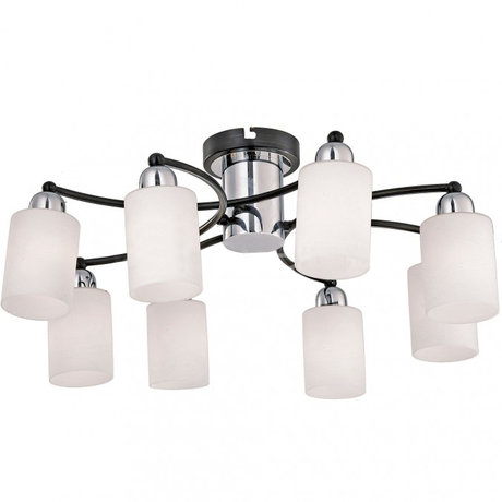 Назначение светильника: для комнаты, Стиль светильника: модерн, Материал светильника: стекло, металл, Ширина: 560, Диаметр: 560, Высота: 190, Количество ламп: 8 шт, Тип лампы: накаливания, Мощность: 40 Вт, Патрон: Е14, Цвет арматуры: хром/черный