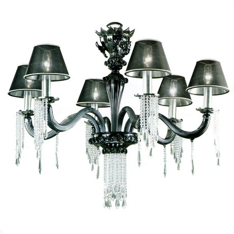 Люстра 6-ти рожковая из коллекции Spark на арматуре из муранского стекла черного цвета. Текстильные абажуры черного цвета с серебряным кантом. Люстра декорирована хрустальными подвесками. Внизу люстры расположилась дополнительная лампочка. Высота светильника регулируется за счет звеньев цепи.