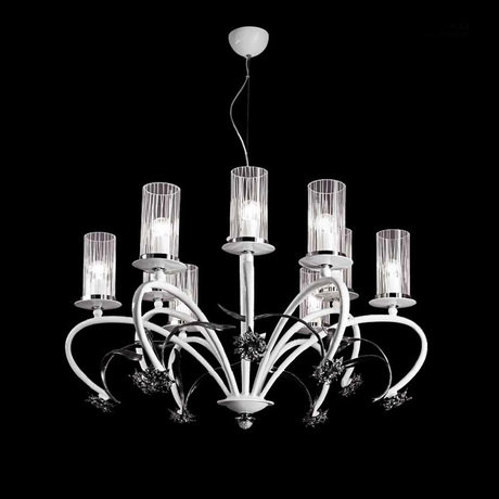 Люстра 5-ти рожковая из коллекции Virgola на арматуре из металла белого цвета с хромированными элементами. Плафоны выполнены из прозрачного стекла. Высота светильника регулируется.
