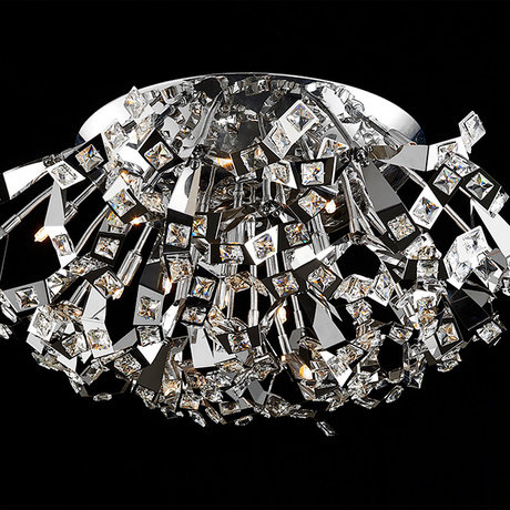 Потолочный светильник на хромированной арматуре. Плафон состоит из множества металлических элементов, в которые помещены прозрачные хрустальные кристаллы.