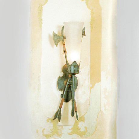Бра однорожковое с оригинальным дизайном на кованной металлической арматуре. Плафон выполнен из матового белого стекла. Цвет арматуры: коричневый с патиной.