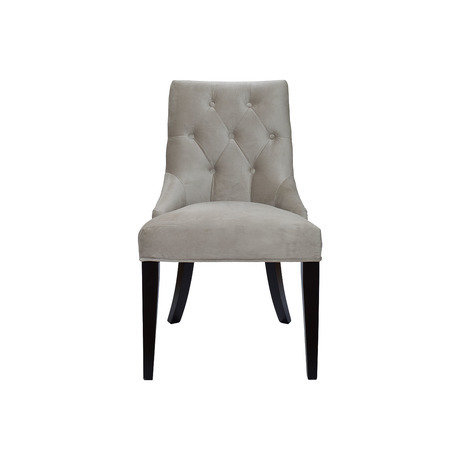 Стул с отделкой из велюра бежевого цвета на деревянных черных ножках. Декорирован металлическими заклепками. Модель выполнена в технике "капитоне".