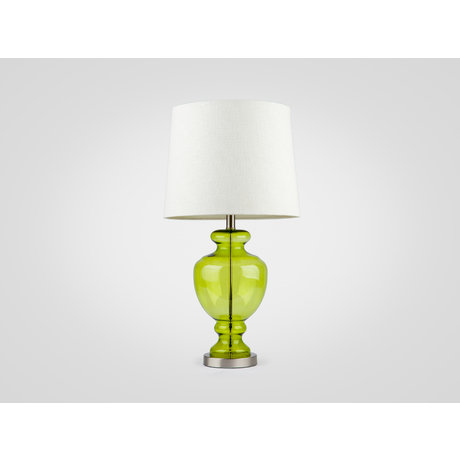 Производство: Китай. Дизайн: Китай. Лампа на ножке из зеленого стекла с белым абажуром из льна.