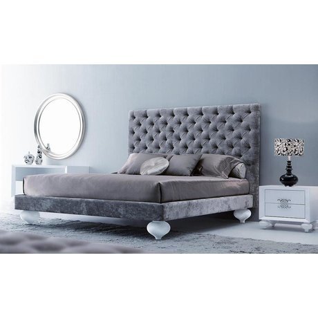 Двуспальная кровать создана по эскизам итальянских дизайнеров элитной мебели. Яркая деталь – высокое изголовье во всю ширину кровати обито бежевым велюром и декорировано стежкой-капитоне.