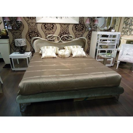 Кровать выполнена в стиле Ар деко. Изголовье обито темно-бежевым велюром с декором из алюминия, покрытого сусальным серебром. База обита темно-бежевым велюром, ножки из нержавеющей стали.