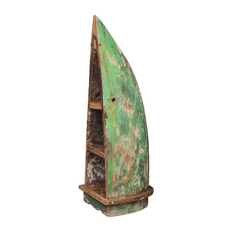 Напольный стеллаж, выполненный из старой рыбацкой лодки изящной вытянутой формы с сохранением оригинальной многослойной окраски. Имеет 3 полки разной вместимости. Подходит для использования как внутри помещения, так и снаружи. Сборка не требуется. Страна производитель - Индонезия. Предмет изготовлен из ценных твердых пород древесины (тик, махагони, суар), обладающих высокой износостойкостью, долговечностью и водоотталкивающими свойствами. Древесину с такими свойствами использовали индонезийские рыбаки для создания лодок, а мебель из нее подходит для использования как внутри помещения, так и снаружи. Покрыт натуральным шеллаком.