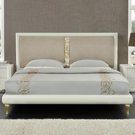 Кровать с решеткой TRENTO отделка шпон дуба (oak veneer) в лаке цвета топленого молока (melted milk), сусальное золото (gold leaf), ткань светло-серый велюр (Moki-51). Размер спального места: 180*200.